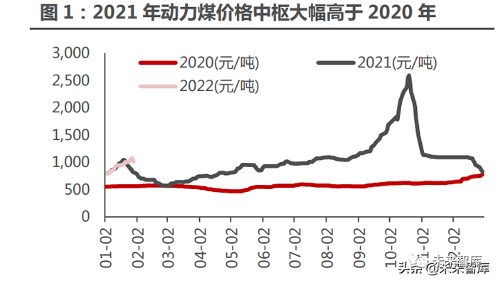 2021年动力煤价格中枢大幅高于 2020 年。据 Wind 数据,2021 年秦皇岛动力煤 Q5500 市场价均价为 1031 元/吨,较 2020 年均价 577 元/吨上涨约 79%。2021年春节前动力煤价格 快速走高,春节期间由于保供任务,煤矿大多正常生产,但下游工业企业放假,需求下滑库存累 积,煤价下跌,春节过后需求恢复,煤管票趋严格,煤价重回上涨通道,随后由于安全事故频发, 导致价格上涨速度加快,于10月下旬达到年内最高点 2592.5 元/吨。进入 2021 年四季度以后, 在保障人民温暖过冬的背景下,政策端不断发布政策促进煤价合理回落。随着增产保供的持续推进,产地供给逐步宽松,此外,政府限价等政策不断推进,价格出现回落。年底由于下游进行春节前补库存,采购节奏加快,煤价重回上涨通道。