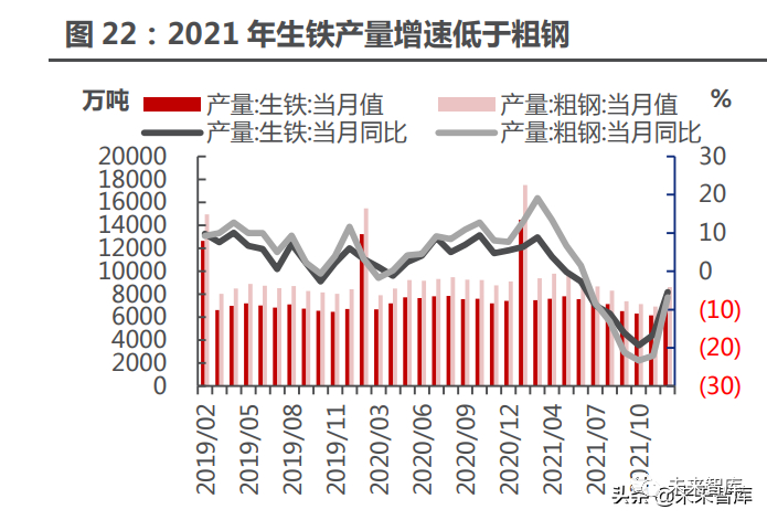 钢铁方面,考虑到 2020 年上半年的低基数影响,2021 年以来钢铁行业固定资产投资实际增 速大幅放缓,对应行业资本开支下行,即新建产能下滑。此外,钢铁行业碳排放量占全国碳排放量 的 18%左右,“双碳”背景下高耗能行业倍严格管控,叠加环保限产的影响,钢铁行业的供给或持 续收缩。Wind 数据显示,2021 年粗钢产量 810.33 亿吨,同比下降 3%,生铁产量 8.69 亿吨, 同比下降 4.3%。生铁产量增速弱于粗钢,电弧炉产量占比提升。
