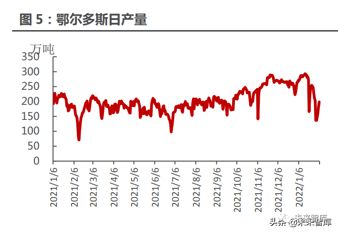 保供状态下的高强度生产预计难以持续。随着保供进入尾声,鄂尔多斯地区的煤炭产量已经 较高点开始下滑,产能核增的矿井在“保供”后若不能及时办理相关手续,或只能按照原产能生 产,此外还有部分矿井为了保供将停产检修延后进行,保供结束后检修或增多,保供期间的高产 量水平预计难以持续。