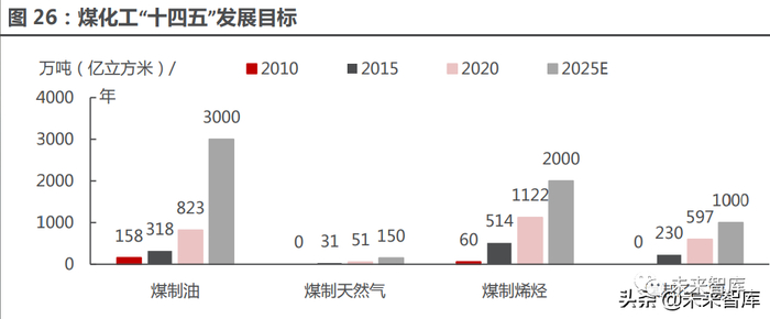 “十四五”规划发展空间仍然较大。近年来,现代煤化工产业快速发展,据新能源网,截至 2020 年煤制油、气、烯烃、乙二醇等四大类投产项目累计完成投资约 6060 亿元,生产主要产品 2647 万吨,开工率分别达到 63.4%、91.7%、96.37%、55.8%,年转化煤炭约 9380 万吨(标煤), 年营业收入 1212 亿元。煤(甲醇)路线乙烯和丙烯产能分别占比 20.1%和 21.5%,煤制乙二醇产能 占全国乙二醇总产能的 38.1%。据《现代煤化工“十四五”发展指南》,“十四五”的发展目标是形成 3000 万吨/年煤制油、150 亿立方米/年煤制气、1000 万吨/年煤制乙二醇、100 万吨/年煤制芳烃、 2000 万吨/年煤(甲醇)制烯烃的产业规模,据此判断,煤化工仍有较大发展空间。