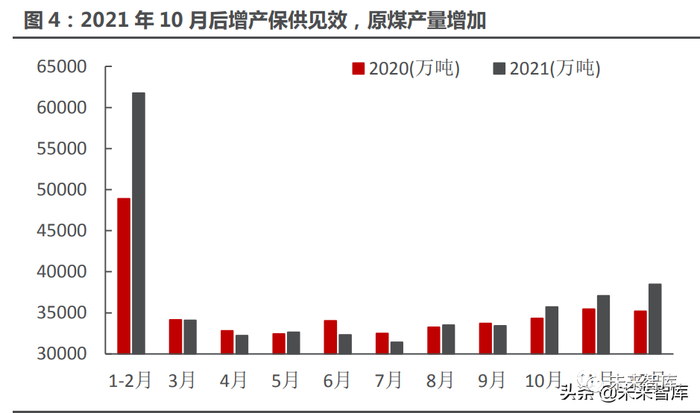2021 年 1-9月原煤产量增长主要由于 2021年年初保供和春节不放假,10 月起增产保供 见效。据统计局数据,1-9 月原煤产量 29.31 亿吨,同比增长 3.7%,其中增量主要来自于 1-2月的保供政策,2020 年春节期间由于疫情停产的低基数背景下产量增速偏高。3-9 月原煤产量 同比增速分别为-0.2%、-1.8%、0.8%、-5%、-3.3%、0.8%与-0.9%,产量实际释放有限。10 月起保供逐步见效,10 月、11 月、12月原煤产量同比增速分别为 4%、4.6%与 7.2%。