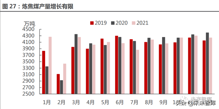 焦煤产量增长潜力有限。从炼焦煤产量来看,除 1-2 月疫情造成的低基数以外,2021 年焦煤 产量持续低于 2020 年。由于焦煤矿井产出含 50%以上的动力煤,因此保供背景下,焦煤矿井的 开工率也处于高位,从 2021 年四季度的产量数据来看,高开工率水平下产量仍略低于去年同期, 说明焦煤生产潜力增长有限。