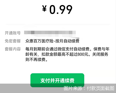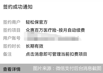 最后,北京商报记者被迫只能选择“支付并开通续费”进行付款投保。保费支付完成后,记者随即收到了微信支付后台的提醒:已经成功签约众惠百万医疗险-按月自动续费,签约长期有效。
