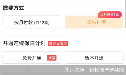 北京商报记者在该链接投保时发现,缴费方式可以选择一次性付清或者是按月付款,还可选择是否开通“连续保障计划”。连续保障计划协议写明:“接受本协议,即表示在投保的保险产品保险期间届满前或保险期间届满后连续保障延续期内,您同意再次发起投保申请并授权轻松保代为从您的账户中自动扣缴保费。”