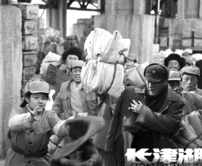 《长津湖》中戴红围巾的车站女兵(左一)。