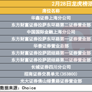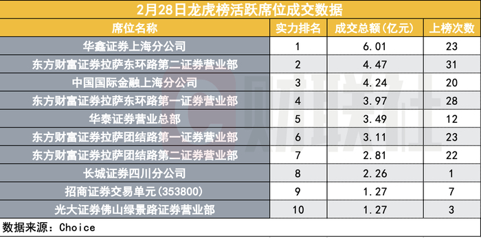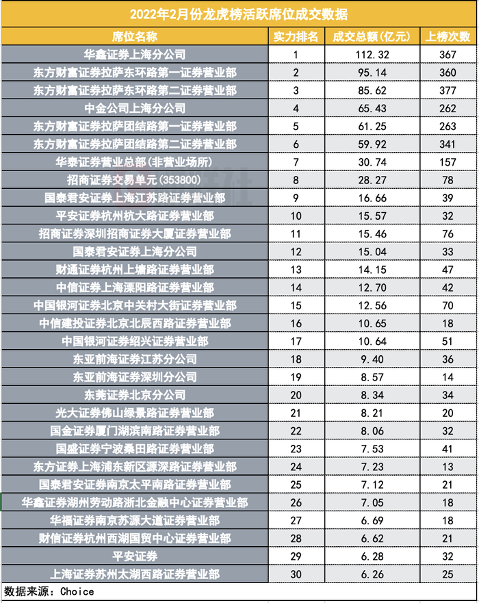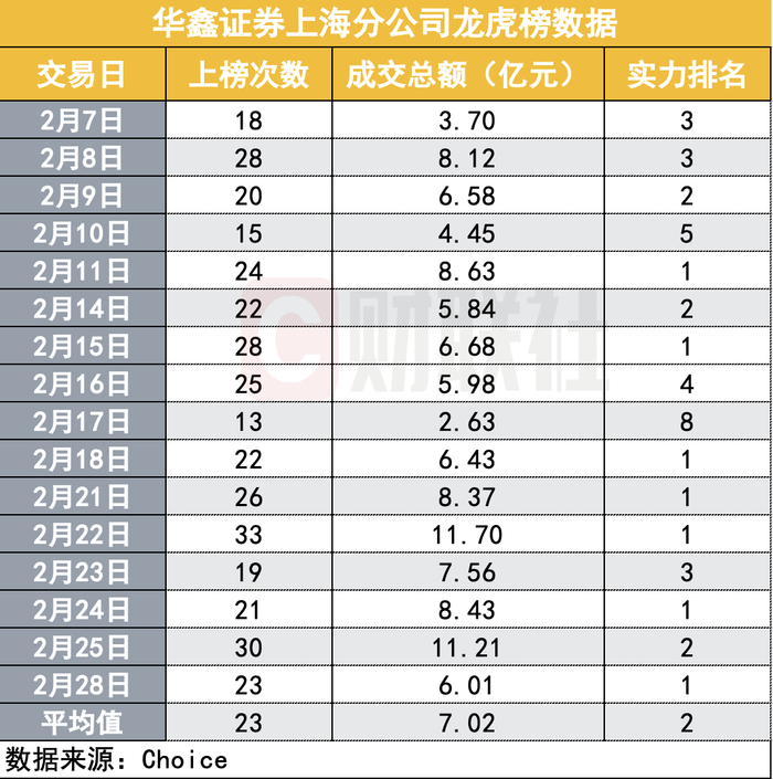 从单日数据看,二月份华鑫上分日均23只股票上榜,日均成交额达7.02亿元,其中七个交易日拿下实力排名第一。