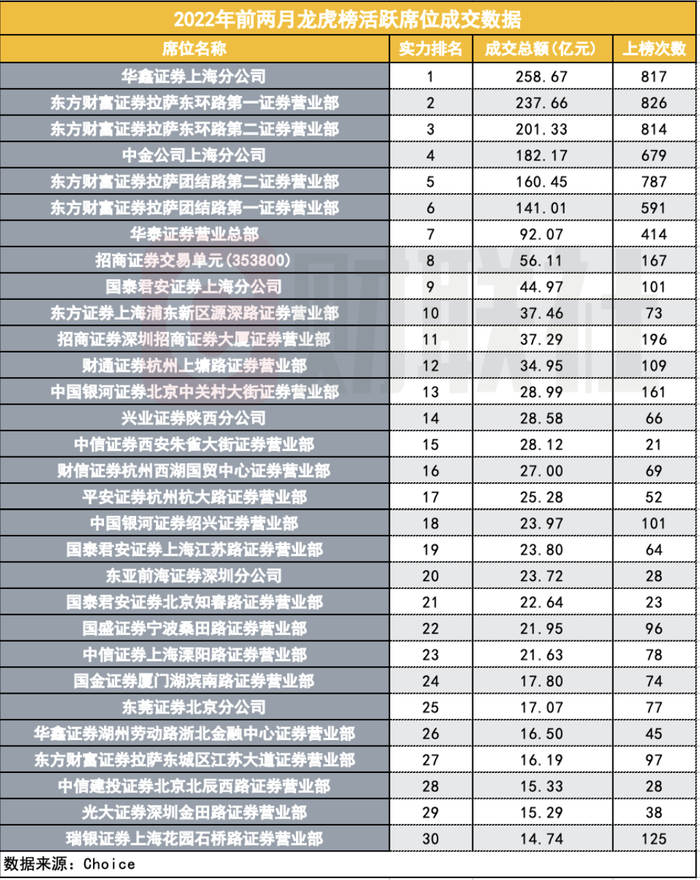 财联社记者统计,今年以来,华鑫上分累计上榜840次,月均420次;总成交额264.68亿元,在龙虎榜中排名第一。进入2月,华鑫上分冲榜势头更猛,日均23只股票上榜,日均成交额达7.02亿元。