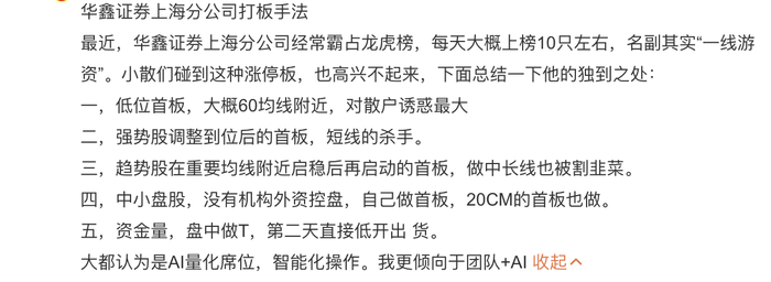 华鑫上分惊人的霸榜实力,令业界佩服,也令市场“胆颤”。有投资者戏称,一看到华鑫上分登上龙虎榜,不由得“心头一紧”。甚至专门总结了华鑫上分的打板手法。