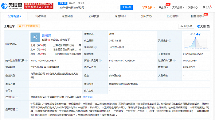 天眼查App显示,2月28日,成都哔哩哔哩科技有限公司成立,法定代表人郑彬炜,注册资本1000万人民币,经营范围含电影摄制服务;电影发行;电视剧制作;电视剧发行等。股东信息显示,该公司由上海哔哩哔哩动画有限公司全资控股。