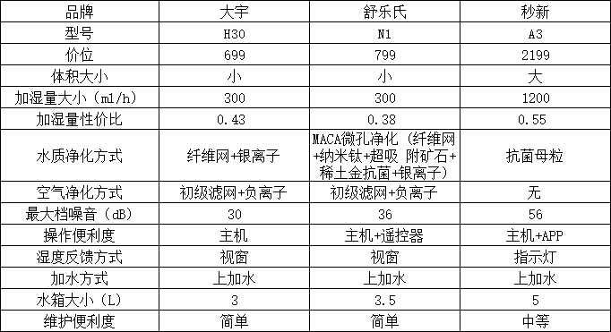 作为加湿器来说需要长时间开启,因此把噪音控制在合理范围十分重要。所以我就测试了一下这三款加湿器在不同档位的噪音表现,并做了一个统计表格,大家可以自取。