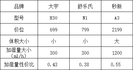 单看加湿量性价比秒新最高0.55,大宇和舒乐氏差不多分别是0.43和0.38。这也基本符合三款无水雾加湿器的定位,秒新突出的就是大加湿量,单看加湿量性价比自然最高。