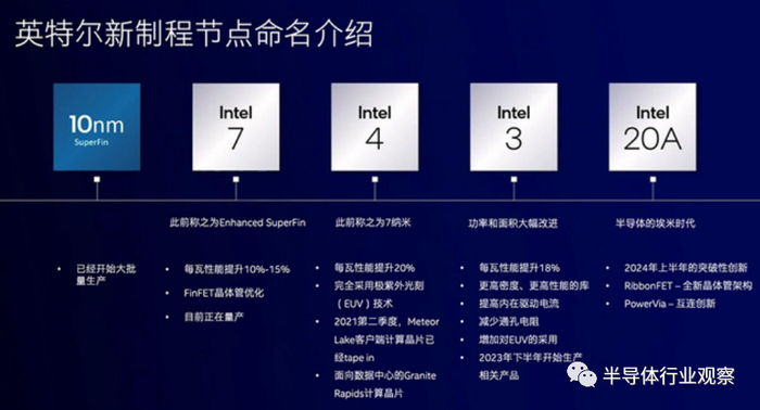 虽然英特尔是IDM企业,但目前他在先进制程方面离3nm仍有距离。在2022年投资者大会上,英特尔曾表示Intel 4也就是7nm预计在2022年下半年投产;Intel 3(第二代7nm)预计在2023年下半年投产;Intel 20A(5nm)将于2024年投产;Intel 18A(第二代5nm)预计在2025年投产。