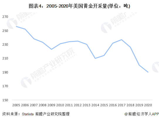 而从产量来看,近年来,美国的黄金开采量呈现波动下降的趋势,2005年美国的黄金年开采量约256吨,到2020年这一数据约190吨。