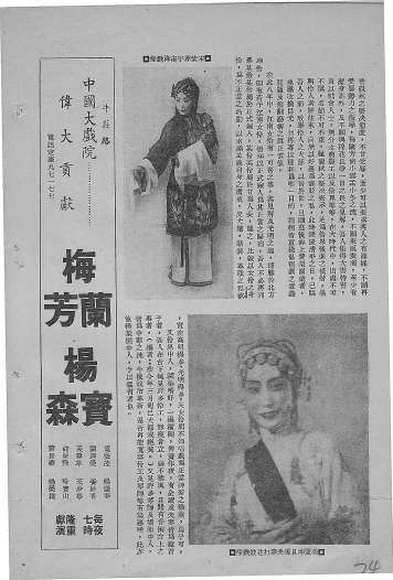 1947年1月15日,《半月戏剧》杂志刊登广告,由梅兰芳领衔梅剧团,与杨森宝、杨盛春、刘连荣、姜妙香、俞振飞等团员,每晚七时在中国大戏院演出。中国大戏院原名三星舞台,位于上海市黄浦区牛庄路704号,1930年初建成,原定于1月30日正月初一开业。但由于上海流氓大亨黄金荣的捣乱,称舞台名为荣记舞台方能开业,经再三调解求情,更名为三星舞台。于是,中国大戏院只能推迟开业。