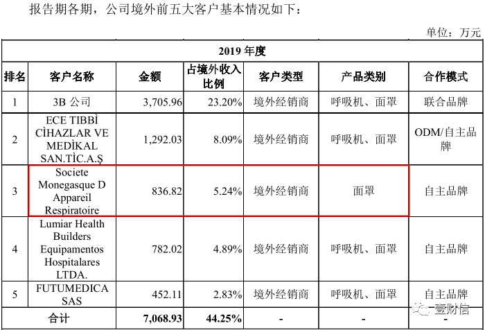 根据招股书,怡和嘉业2019年境外前五大客户中,Societe Monegasque D Appareil Respiratoire是位列第三,主要向怡和嘉业采购面罩836.82万元。