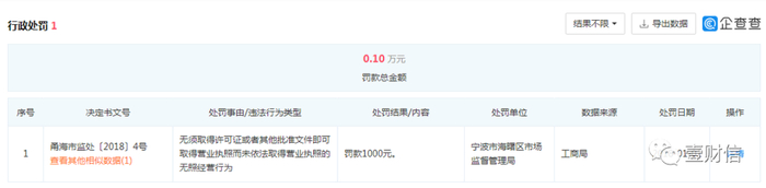 据企查查,贝博贸易于2017年4月份开始在宁波市中山东路181号中农信大厦1207室设立“飞利浦伟康睡眠呼吸体验中心”,为其产品做售后清洗、维护等服务。至2017年11月28日被执法人员查获,该中心尚未领取注册地址为宁波市中山东路181号中农信大厦1207室的营业执照。2018年1月2日,宁波市海曙区市场监督管理局对其做出处罚,罚款1,000.00元。
