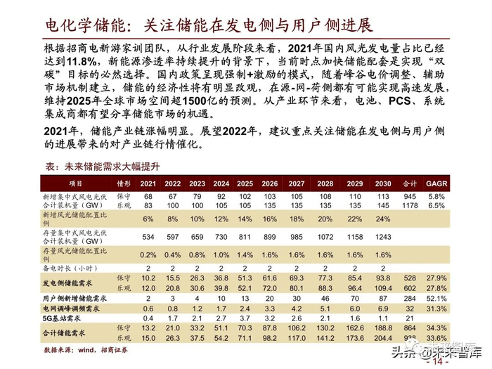 根据招商电新游家训团队,从行业发展阶段来看,2021年国内风光发电量占比已经 达到11.8%,新能源渗透率持续提升的背景下,当前时点加快储能配套是实现“双 碳”目标的必然选择。国内政策呈现强制+激励的模式,随着峰谷电价调整、辅助 市场机制建立,储能的经济性将有明显改观,在源-网-荷侧都有可能实现高速发展, 维持2025年全球市场空间超1500亿的预测。从产业环节来看,电池、PCS、系统 集成商都有望分享储能市场的机遇。