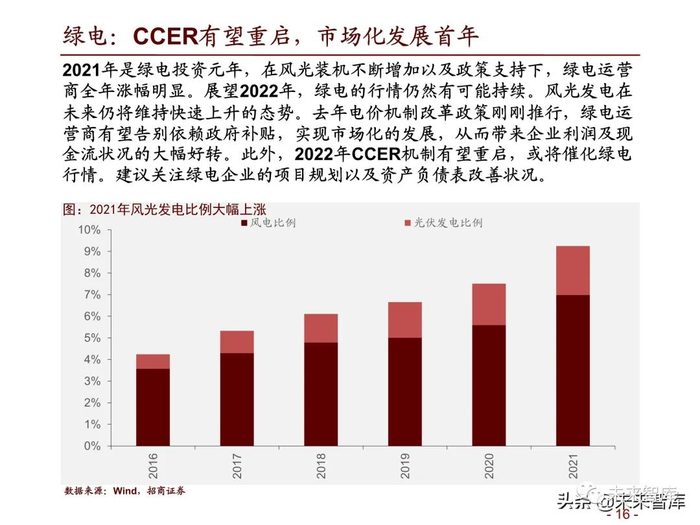 2021年是绿电投资元年,在风光装机不断增加以及政策支持下,绿电运营 商全年涨幅明显。展望2022年,绿电的行情仍然有可能持续。风光发电在 未来仍将维持快速上升的态势。去年电价机制改革政策刚刚推行,绿电运 营商有望告别依赖政府补贴,实现市场化的发展,从而带来企业利润及现 金流状况的大幅好转。此外,2022年CCER机制有望重启,或将催化绿电 行情。建议关注绿电企业的项目规划以及资产负债表改善状况。