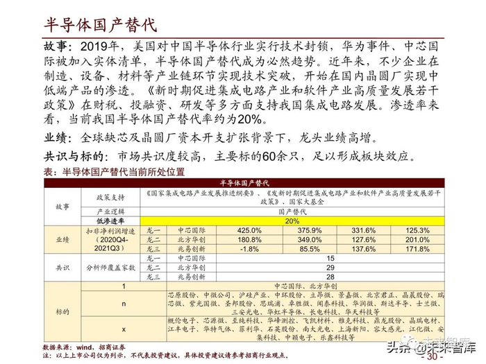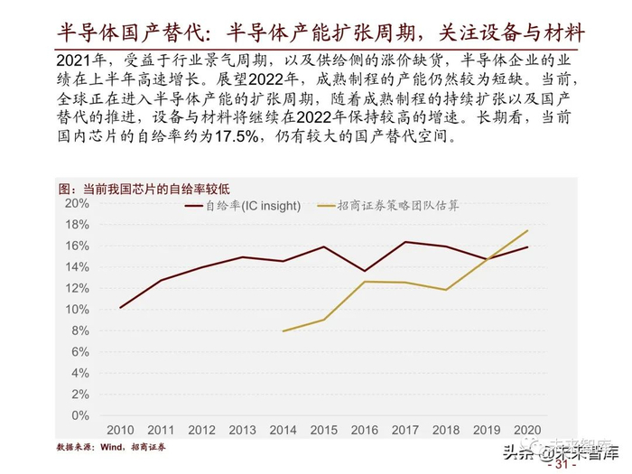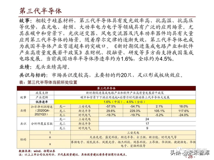 故事:相较于硅基材料,第三代半导体具有发光效率高、抗高温、抗高压 等优势,在光电、射频、大功率电力电子等领域具有广泛的应用场景。尤 其在碳中和背景下,光伏逆变器、风电变流器及汽车功率器件均具有大量 应用第三代半导体的场景。随着摩尔定律的逐渐失效,第三代半导体也成 为我国半导体产业弯道超车的突破口。《新时期促进集成电路产业和软件 产业高质量发展若干政策》在财税、投融资、研发等多方面支持我国集成 电路发展。当前我国功率半导体渗透率约为1.6%,全球约为4.5%。
