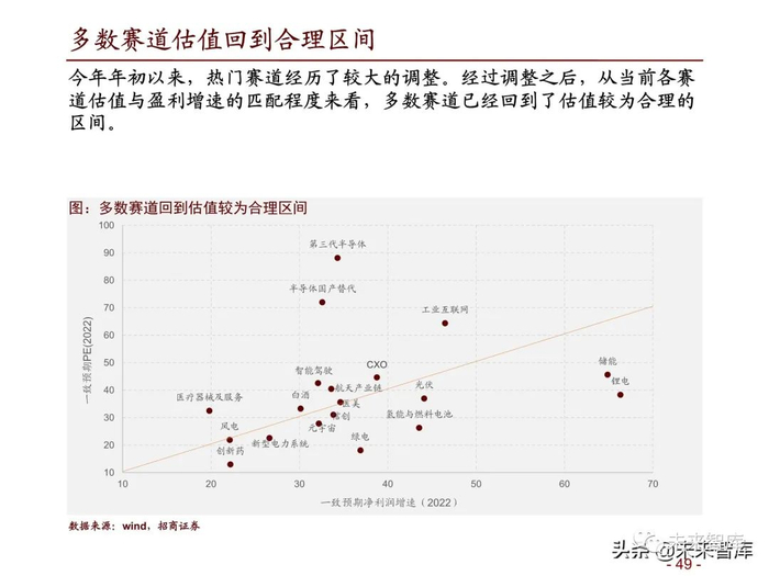 多数赛道估值回到合理区间:今年年初以来,热门赛道经历了较大的调整。经过调整之后,从当前各赛 道估值与盈利增速的匹配程度来看,多数赛道已经回到了估值较为合理的 区间。