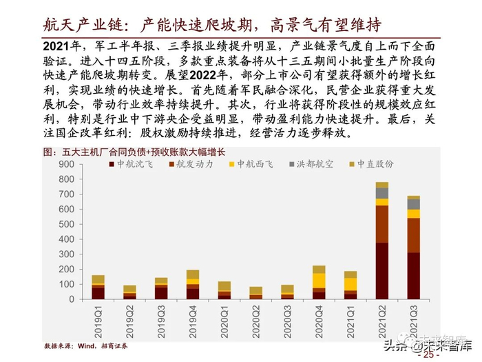 2021年,军工半年报、三季报业绩提升明显,产业链景气度自上而下全面 验证。进入十四五阶段,多款重点装备将从十三五期间小批量生产阶段向 快速产能爬坡期转变。展望2022年,部分上市公司有望获得额外的增长红 利,实现业绩的快速增长。首先随着军民融合深化,民营企业获得重大发 展机会,带动行业效率持续提升。其次,行业将获得阶段性的规模效应红 利,特别是行业中下游央企受益明显,带动盈利能力快速提升。最后,关 注国企改革红利:股权激励持续推进,经营活力逐步释放。