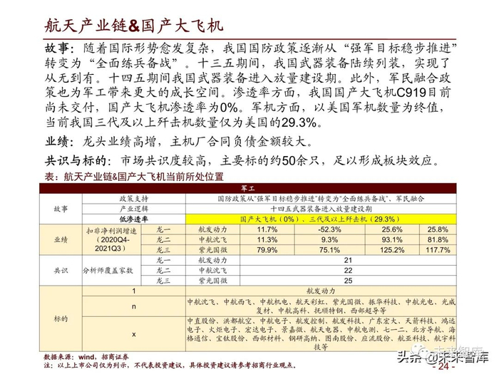 故事:随着国际形势愈发复杂,我国国防政策逐渐从“强军目标稳步推进” 转变为“全面练兵备战”。十三五期间,我国武器装备陆续列装,实现了 从无到有。十四五期间我国武器装备进入放量建设期。此外,军民融合政 策也为军工带来更大的成长空间。渗透率方面,我国国产大飞机C919目前 尚未交付,国产大飞机渗透率为0%。军机方面,以美国军机数量为终值, 当前我国三代及以上歼击机数量仅为美国的29.3%。