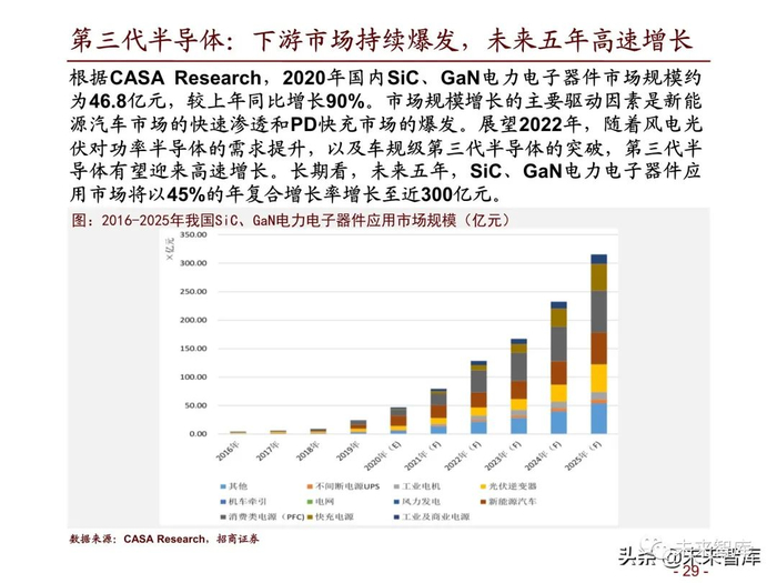根据CASA Research,2020年国内SiC、GaN电力电子器件市场规模约 为46.8亿元,较上年同比增长90%。市场规模增长的主要驱动因素是新能 源汽车市场的快速渗透和PD快充市场的爆发。展望2022年,随着风电光 伏对功率半导体的需求提升,以及车规级第三代半导体的突破,第三代半 导体有望迎来高速增长。长期看,未来五年,SiC、GaN电力电子器件应 用市场将以45%的年复合增长率增长至近300亿元。(报告来源:未来智库)