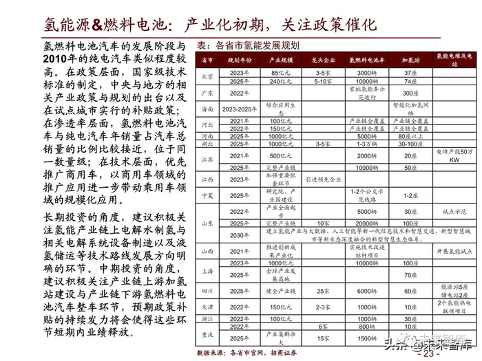 长期投资的角度,建议积极关 注氢能产业链上电解水制氢与 相关电解系统设备制造以及液 氢储运等技术路线发展方向明 确的环节。中期投资的角度, 建议积极关注产业链上游加氢 站建设与产业链下游氢燃料电 池汽车整车环节,预期政策补 贴的持续发力将会使得这些环 节短期内业绩释放。