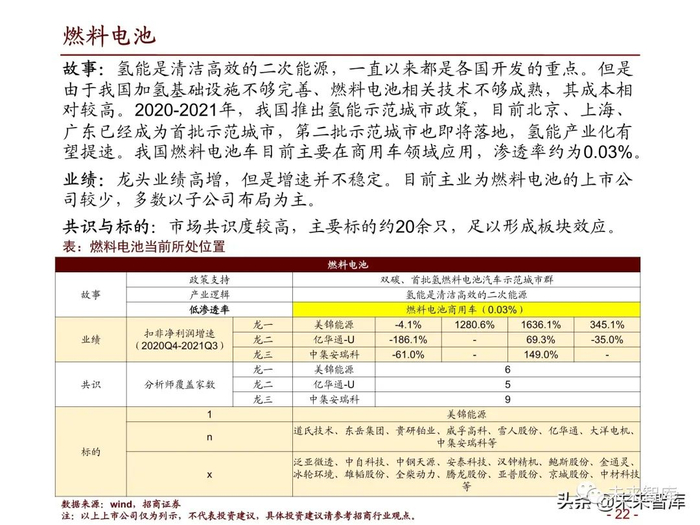 故事:氢能是清洁高效的二次能源,一直以来都是各国开发的重点。但是 由于我国加氢基础设施不够完善、燃料电池相关技术不够成熟,其成本相 对较高。2020-2021年,我国推出氢能示范城市政策,目前北京、上海、 广东已经成为首批示范城市,第二批示范城市也即将落地,氢能产业化有 望提速。我国燃料电池车目前主要在商用车领域应用,渗透率约为0.03%。(报告来源:未来智库)