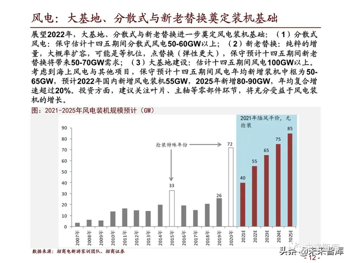 展望2022年,大基地、分散式与新老替换进一步奠定风电装机基础:(1)分散式 风电:保守估计十四五期间分散式风电50-60GW以上;(2)新老替换:纯粹的增 量,大概率扩容,可能是等机位,点替换(弹性更大),保守预计十四五期间新老 替换将带来50-70GW需求;(3)大基地建设:估计十四五期间风电100GW以上。考虑到海上风电与其他项目,保守预计十四五期间风电年均新增装机中枢为50- 65GW,预计2022年国内新增风电装机55GW,2025年新增80-90GW,年均复合增 速超过20%。(报告来源:未来智库)