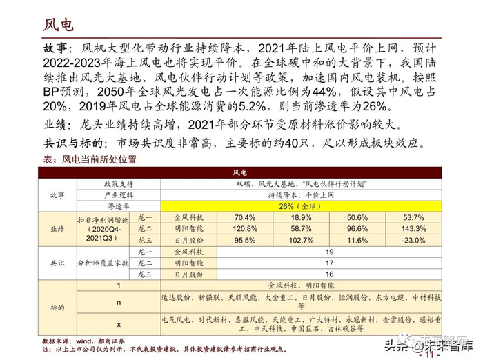故事:风机大型化带动行业持续降本,2021年陆上风电平价上网,预计 2022-2023年海上风电也将实现平价。在全球碳中和的大背景下,我国陆 续推出风光大基地、风电伙伴行动计划等政策,加速国内风电装机。按照 BP预测,2050年全球风光发电占一次能源比例为44%,假设其中风电占 20%,2019年风电占全球能源消费的5.2%,则当前渗透率为26%。