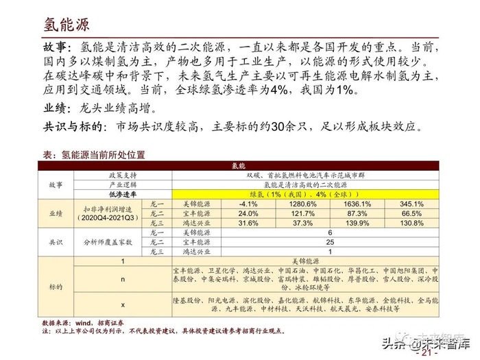 故事:氢能是清洁高效的二次能源,一直以来都是各国开发的重点。当前, 国内多以煤制氢为主,产物也多用于工业生产,以能源的形式使用较少。在碳达峰碳中和背景下,未来氢气生产主要以可再生能源电解水制氢为主, 应用到交通领域。当前,全球绿氢渗透率为4%,我国为1%。