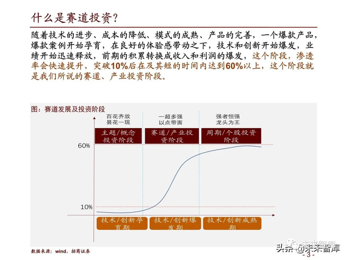 随着技术的进步、成本的降低、模式的成熟、产品的完善,一个爆款产品, 爆款案例开始孕育,在良好的体验感带动之下,技术和创新开始爆发,业 绩开始迅速释放,前期的积累转换成收入和利润的爆发,这个阶段,渗透 率会快速提升,突破10%后在及其短的时间内达到60%以上,这个阶段就 是我们所说的赛道、产业投资阶段。