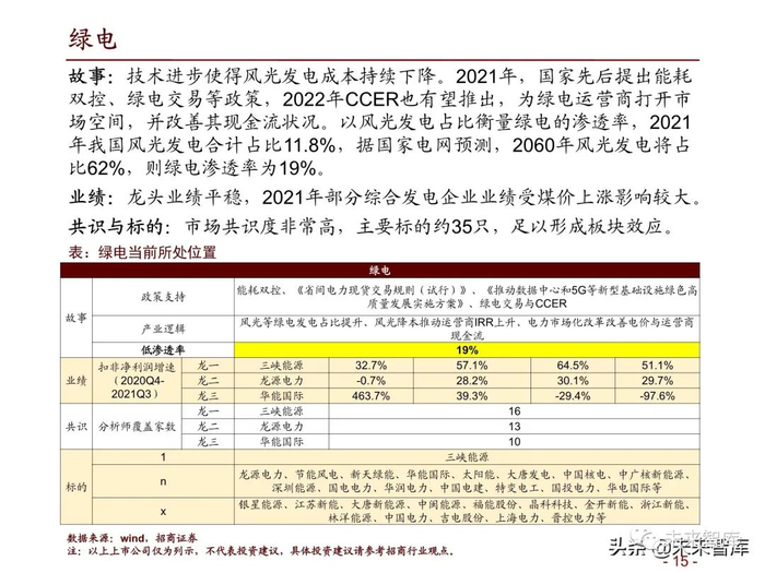 故事:技术进步使得风光发电成本持续下降。2021年,国家先后提出能耗 双控、绿电交易等政策,2022年CCER也有望推出,为绿电运营商打开市 场空间,并改善其现金流状况。以风光发电占比衡量绿电的渗透率,2021 年我国风光发电合计占比11.8%,据国家电网预测,2060年风光发电将占 比62%,则绿电渗透率为19%。