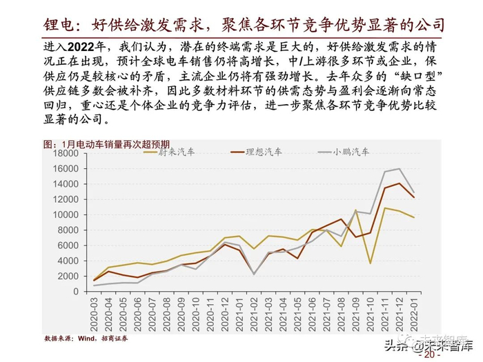 进入2022年,我们认为,潜在的终端需求是巨大的,好供给激发需求的情 况正在出现,预计全球电车销售仍将高增长,中/上游很多环节或企业,保 供应仍是较核心的矛盾,主流企业仍将有强劲增长。去年众多的“缺口型” 供应链多数会被补齐,因此多数材料环节的供需态势与盈利会逐渐向常态 回归,重心还是个体企业的竞争力评估,进一步聚焦各环节竞争优势比较 显著的公司。