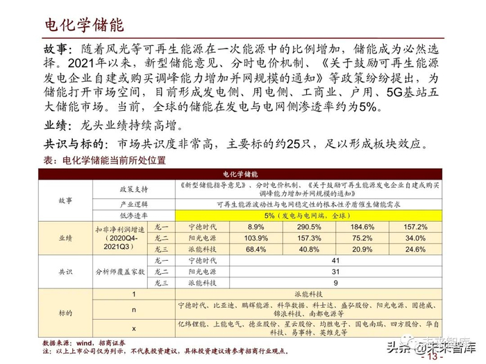 故事:随着风光等可再生能源在一次能源中的比例增加,储能成为必然选 择。2021年以来,新型储能意见、分时电价机制、《关于鼓励可再生能源 发电企业自建或购买调峰能力增加并网规模的通知》等政策纷纷提出,为 储能打开市场空间,目前形成发电侧、用电侧、工商业、户用、5G基站五 大储能市场。当前,全球的储能在发电与电网侧渗透率约为5%。