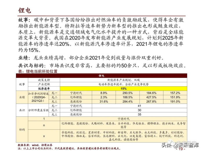 故事:碳中和背景下各国纷纷推出对燃油车的负激励政策,使得车企有激 励推出新能源车型。特斯拉等造车新势力新车型的推出也形成鲢鱼效应, 本质上,新能源车是交通领域电气化水平提升的一种方式,背后是全球能 源变革大背景。我国在2020年发布新能源产业发展规划,计划到2025年新 能源车的渗透率达20%。以新能源汽车渗透率计算,2021年锂电的渗透率 约为15%。
