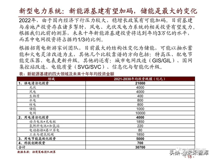 2022年,由于国内经济下行压力较大,稳增长政策有可能加码。目前基建 与房地产投资存在诸多掣肘,风电、光伏及电力系统的相关投资有望发力。根据我们此前的测算,未来十年新能源基建投资将达到年均3万亿的水平, 而其中电网投资将占据约1/3的比例。根据招商电新游家训团队,目前最大的结构性变化为储能,可能以抽水蓄 能和火电灵活改造为主,其他几个比较靠谱的方向包括:特高压、配电节 能变压器、电表更新升级。其他的还有:城市电网改造(GIS/GIL)、国网 集控站改造、电能质量(SVG/SVC)、信息化与智能化升级。
