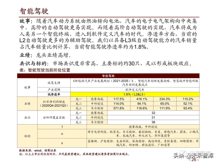 故事:随着汽车动力系统由燃油转向电池,汽车的电子电气架构向中央集 中,高阶的自动驾驶更易实现。而随着高阶自动驾驶的实现,汽车将成为 人类另一个智能终端,进入到软件定义汽车的时代。渗透率方面,当前的 L2自动驾驶更多的为辅助驾驶。我们以具备L3级自动驾驶能力的汽车销量 占汽车销量比例计算,当前智能驾驶渗透率约为1.8%。