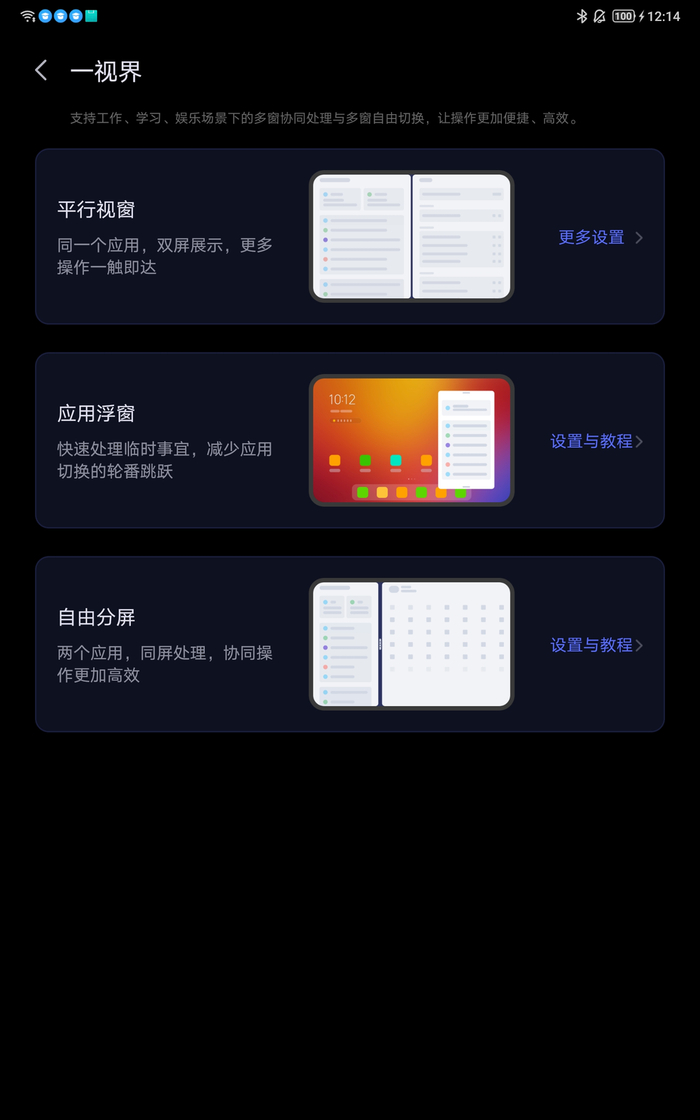 在一视界设置中平板该有的功能也都有,双屏显示、应用浮窗和自由分屏。增强了平板多场景使用条件下的实用性,但这些功能并不是所有APP都支持,所以实际好不好用还得看APP适配程度。