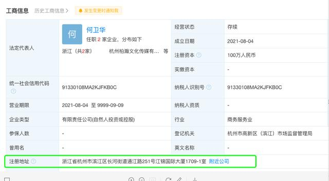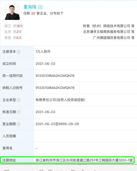 但红星资本局发现,薇娅老公董海峰旗下的杭州兰海企业管理咨询公司、杭州丰瀚企业管理有限公司的注册地址,与柏峰文化的注册地址同在杭州市滨江区江锦国际大厦内,只隔了5层楼。