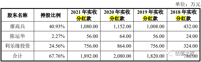 其中,实际控制人廖高兵、陈运华及其控制的利乐缘共计实际收到780万元、1820万元、2080万元、1892万元的分红款,详见下表: