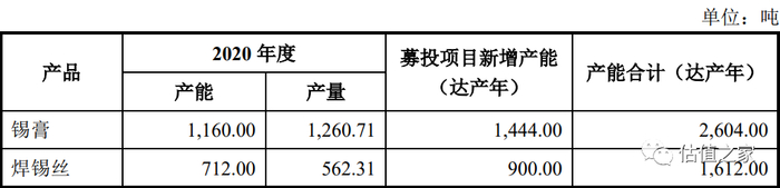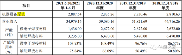 据招股书披露,2020年机器设备原值为2835.26万元,对应微电子焊接材料的产能为2672万吨,对应辅助焊接材料的产能为6470万吨,详见下表:
