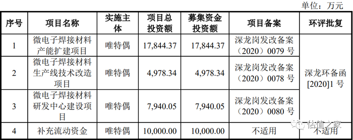 由表可见,“微电子焊接材料产能扩建项目”系第一大募投项目,投资总额高达1.78亿元。