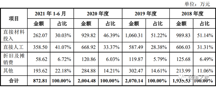 由表可见,报告期内研发费用中的直接材料投入占比快速下降,从2018年的51.14%下降至2021上半年的30.03%,下降幅度超20个百分点,尤其是2021上半年直接材料投入金额仅为262.07万元,年化金额远低于2020年。