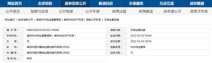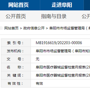 中国质量新闻网讯 2022年3月2日,安徽省阜阳市人民政府网站发布医疗器械监督检查月报表(2月份)。具体信息如下: