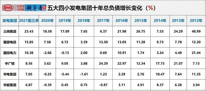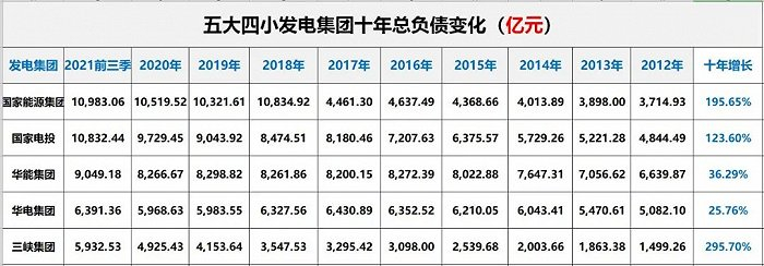 十年间,只有中国大唐集团总负债为负增长,4家发电集团总负债增长在100%以上,依次为三峡集团,总负债增长295.70%;中国广核集团,增长208.30%;国家能源投资集团,增长195.65%;国家电力投资集团,增长123.60%。