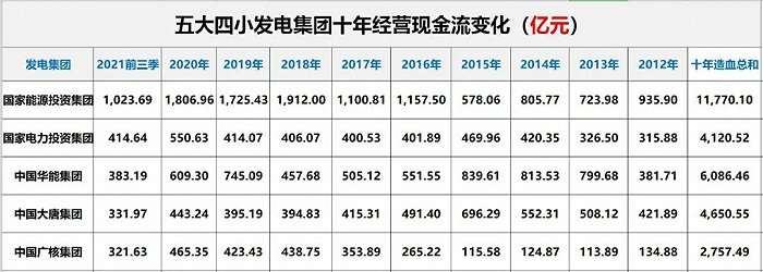 近十年间,五大四小发电集团合计造血(经营现金流净额)4.27万亿元,其中国家能源投资集团合计造血1.18万亿,造血力高居第一位。