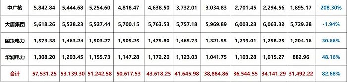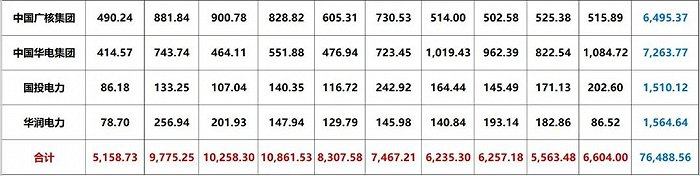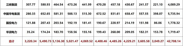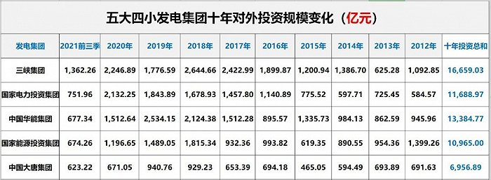同时,近十年五大四小发电集团合计对外投资7.65万亿。其中,三峡集团、国家电力投资集团、中国华能集团、国家能源投资集团年度对外投资规模均突破1000亿元。