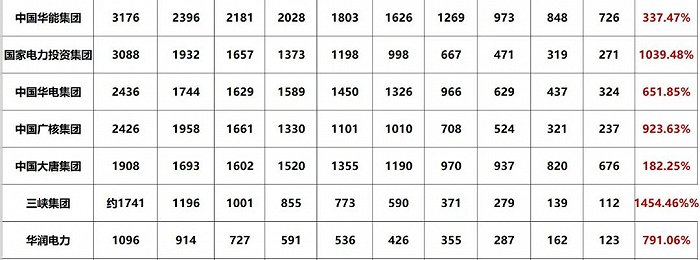 从增速看,十年间有五家发电集团总装机容量增长在100%以上,中国广核集团和三峡集团分别以470.87%和200%的涨幅位列一二位。